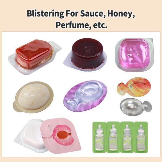 ความแตกต่างที่สำคัญที่สุดระหว่างอุปกรณ์นี้กับเครื่องบรรจุภัณฑ์แบบแผงพลาสติก (Blister Packaging Machinery) แบบดั้งเดิมสำหรับวัสดุที่เป็นของแข็ง อยู่ที่การออกแบบให้เหมาะสมกับวัสดุที่เป็นของเหลวโดยเฉพาะ อุปกรณ์บรรจุภัณฑ์แบบแผงพลาสติกมาตรฐานจะเน้นที่การป้อนและการจัดวางผลิตภัณฑ์ที่เป็นของแข็ง ในขณะที่รุ่นที่เน้นของเหลวจะให้ความสำคัญกับความแม่นยำในการบรรจุ การออกแบบป้องกันการหยด ความเสถียรของอุณหภูมิของวัสดุ และความสามารถในการขึ้นรูปที่ปรับเปลี่ยนได้ตามคุณลักษณะของของเหลวที่แตกต่างกัน อุปกรณ์นี้สามารถใช้ได้กับวัสดุหลากหลายชนิด รวมถึงของเหลวสำหรับรับประทานที่ไหลได้ดี น้ำผึ้งที่มีความหนืดสูง ช็อกโกแลตข้น แยม เนย เซรั่มเครื่องสำอาง และเจลยา ทำให้เป็นอุปกรณ์หลักสำหรับการบรรจุของเหลวแบบหน่วยเดียวในการผลิตสมัยใหม่
