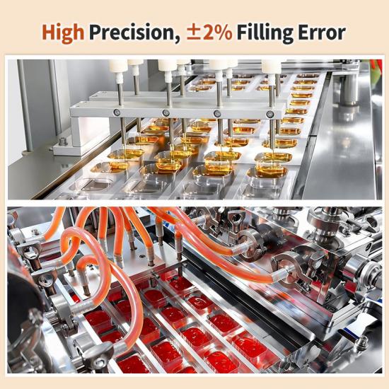 เหมาะอย่างยิ่งสำหรับการบรรจุแยม เนย ซอสมะเขือเทศ น้ำสลัด ช็อกโกแลตเพสต์ เครื่องปรุงรสเหลว และผลิตภัณฑ์อาหารอื่นๆ ฟังก์ชันการเปลี่ยนแม่พิมพ์อย่างรวดเร็วปรับให้เข้ากับการผลิตหลายขนาดและหลายรสชาติ ชิ้นส่วนที่สัมผัสกับอาหารทำจากวัสดุเกรดอาหารตรงตามมาตรฐานความปลอดภัยด้านอาหารระดับสากล และระบบการบรรจุและการปิดผนึกที่เสถียรช่วยป้องกันการรั่วไหลและยืดอายุการเก็บรักษา ไม่ว่าคุณจะต้องการเครื่องบรรจุแบบแผงสำหรับซอสมะเขือเทศ แยม เนย หรือช็อกโกแลต อุปกรณ์ของเราสามารถมอบโซลูชันที่สมบูรณ์แบบให้คุณได้
