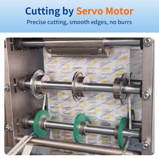 กลไกการตัดที่ขับเคลื่อนด้วยมอเตอร์เซอร์โว ทำงานประสานกับสถานีตัด (ควบคุมด้วยกระบอกสูบลม) ทำให้มีความแม่นยำในการตัด 0.01 มม. และเพิ่มประสิทธิภาพขึ้น 30% เทคโนโลยีนี้ช่วยเพิ่มความเร็วในการผลิต พร้อมทั้งรักษาขอบบรรจุภัณฑ์ให้เรียบเนียนและสวยงาม ตอบโจทย์การผลิตที่มีความต้องการสูง